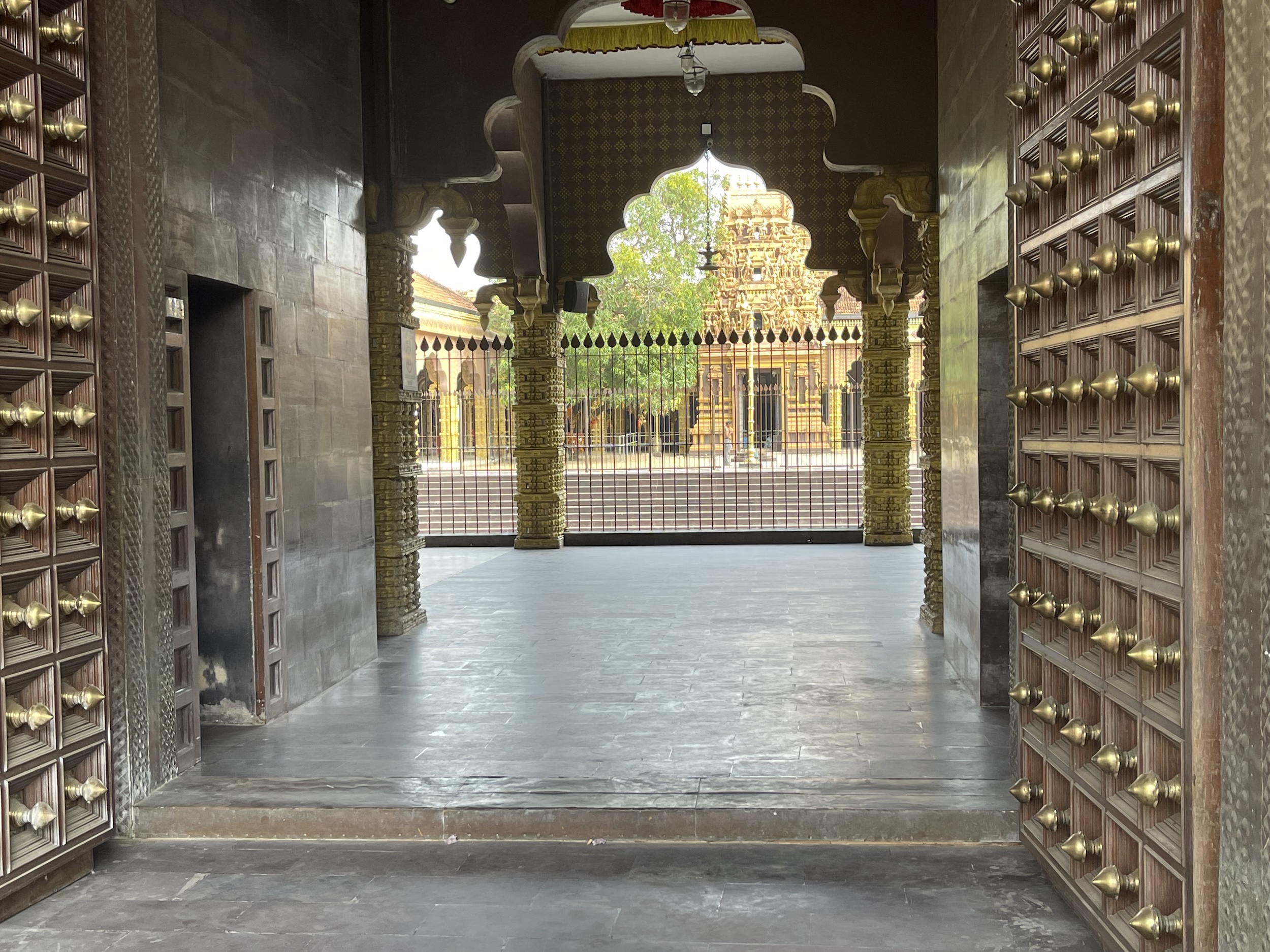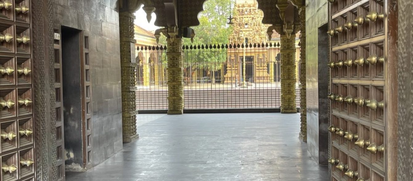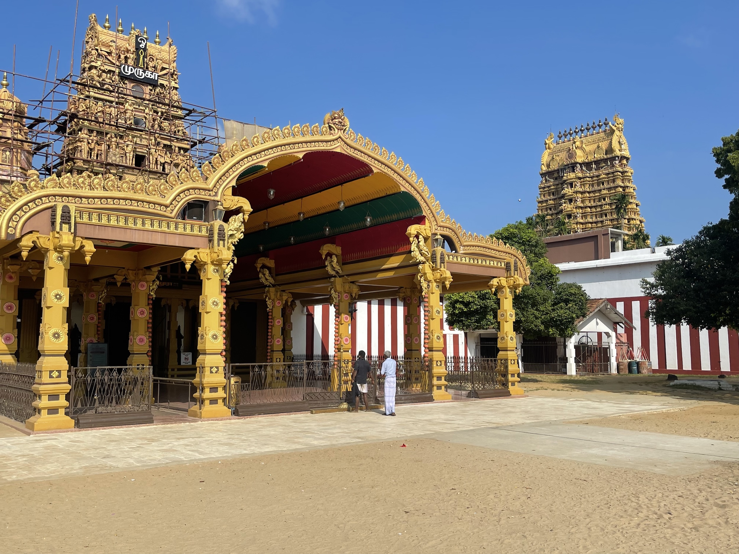 Before leaving the hotel this morning, I took a rickshaw to visit the Nallur Kandaswamy Devasthanam temple. I had forgotten my “temple trousers,” the pair I had had to buy in Thailand to visit a temple there. No problem—I bought another pair for $1.35. Everything is relative: the hotel owner thought I had paid a lot. To enter the temple, I also had to remove my T-shirt, a rule that does not apply to women.