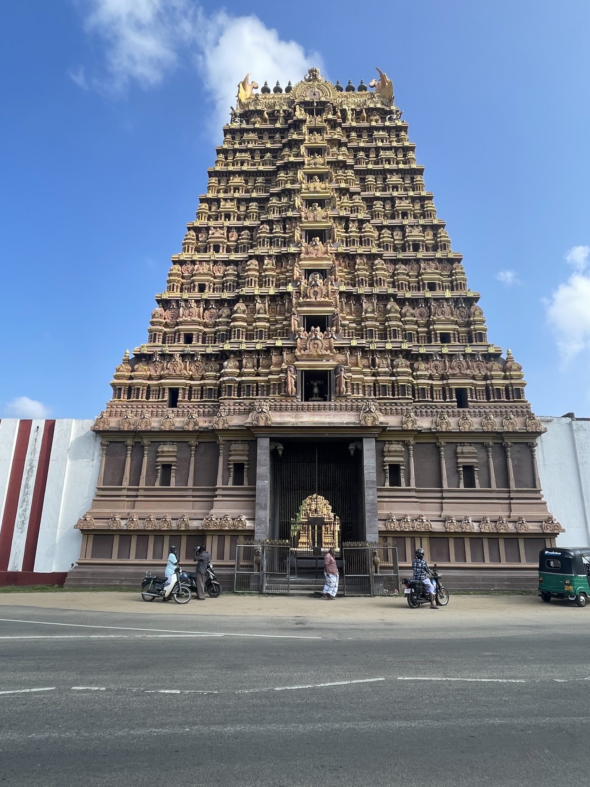 Avant de quitter l’hôtel ce matin, j’ai pris un rickshaw pour aller visiter le temple Nallur Kandaswamy Devasthanam. J’avais oublié mon « pantalon de temple », celui que j’avais dû acheter en Thaïlande pour visiter un sanctuaire. Qu’à cela ne tienne, j’en ai acheté un autre pour 1,35 $. Comme quoi tout est relatif : le propriétaire de l’hôtel trouvait que j’avais payé cher. Pour entrer dans le temple, il fallait également enlever son t-shirt, une règle qui ne s’applique pas aux femmes.