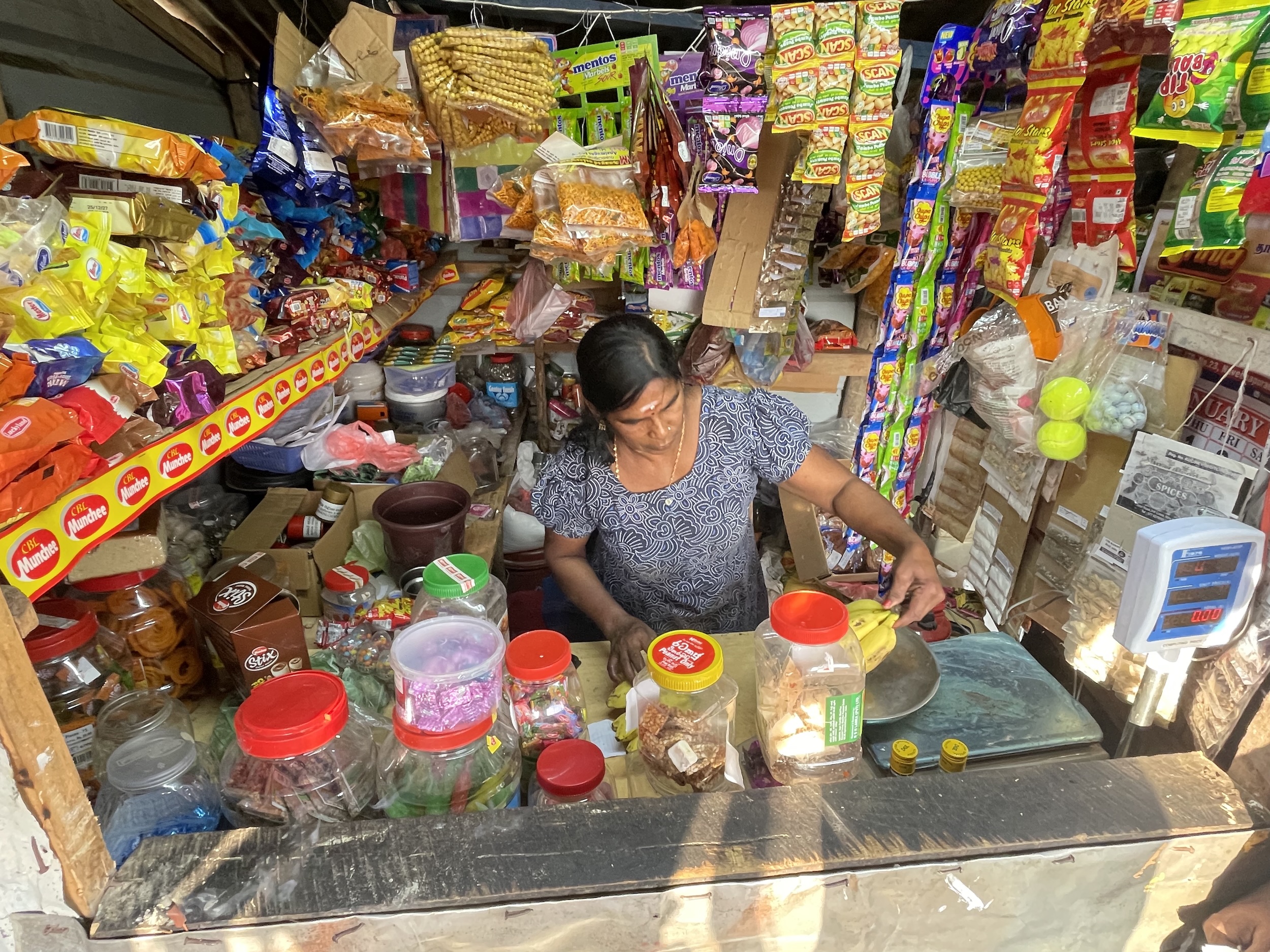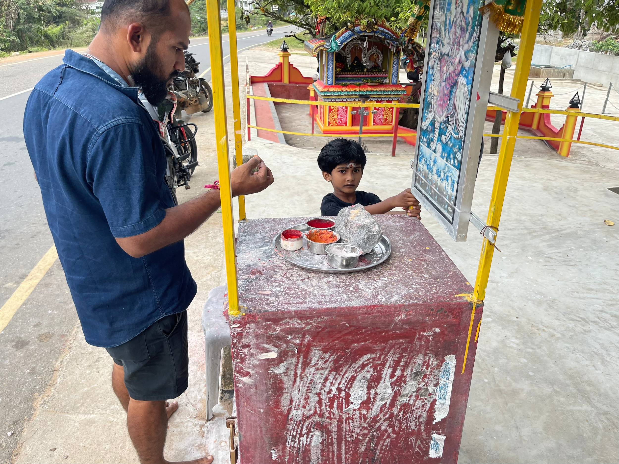 Je suis passé devant un kovil (un kovil de Kali, déesse de la destruction du mal et de bien d’autres attributs) qui a attiré mon attention par l’animation à l’extérieur et la musique. Je me suis arrêté quelques instants pour m’imprégner de l’ambiance. J’étais au bon endroit au bon moment pour voir une enfant recevoir le tilak de son père. Ce geste consiste à tracer des marques ou à déposer un point sur le visage, parfois ailleurs sur le corps, en signe, entre autres, de protection divine.