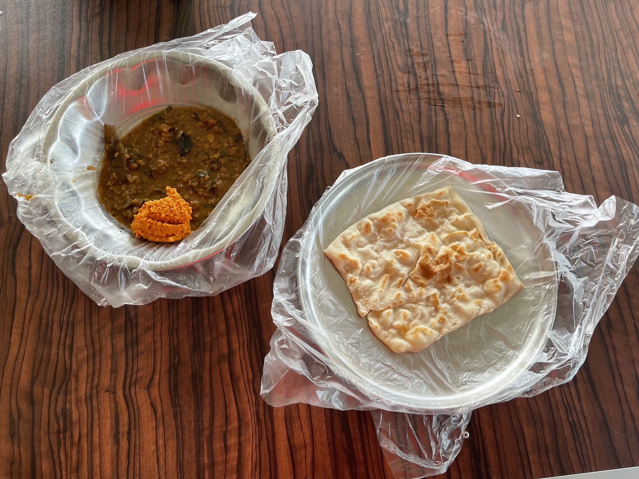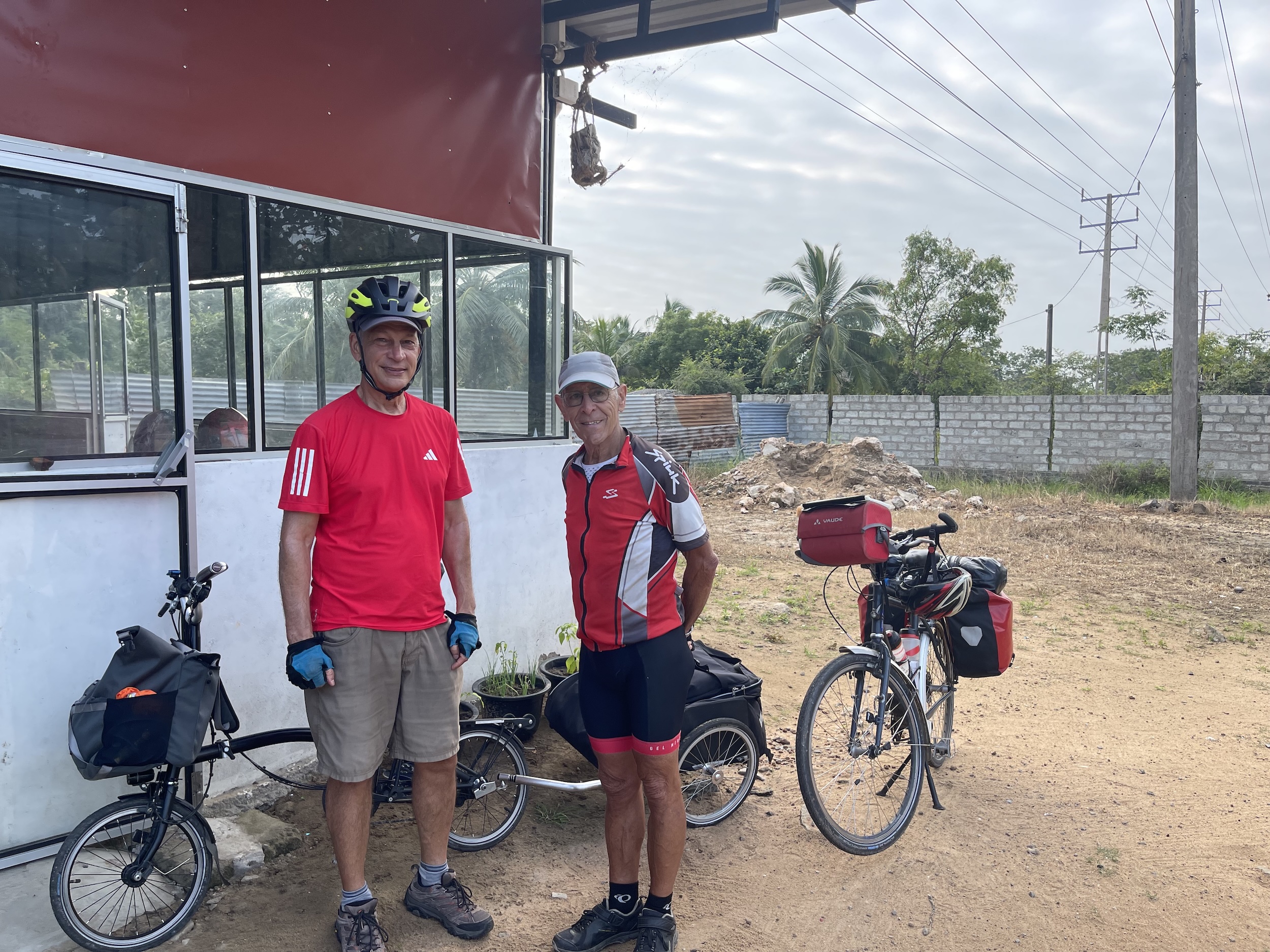 I had gone well past Elephant Pass when I stopped to eat. Breakfast service at the hotel did not start until 7:30 a.m., while I was already ready to leave at 7:00, so I left without waiting. I spotted a place by the roadside, ideal for leaving the bike for a few minutes. As I was enjoying a paratha for 25 cents, an unbeatable price, the famous cyclist arrived. He had stopped along the way and had seen me pass. He is a 76‑year‑old man, on his second cycling trip in Sri Lanka, and he plans to travel for three months. Apparently, there is also a Japanese cyclist touring the area. My route turned off barely two kilometres further on, and that is where we said goodbye.