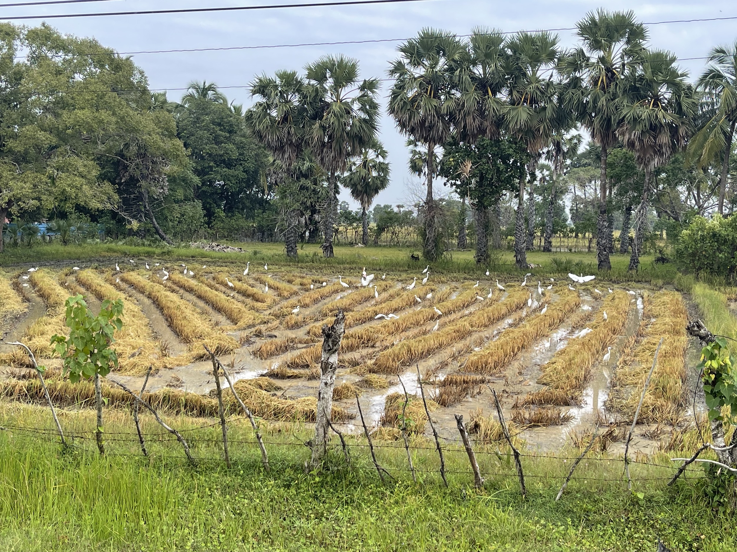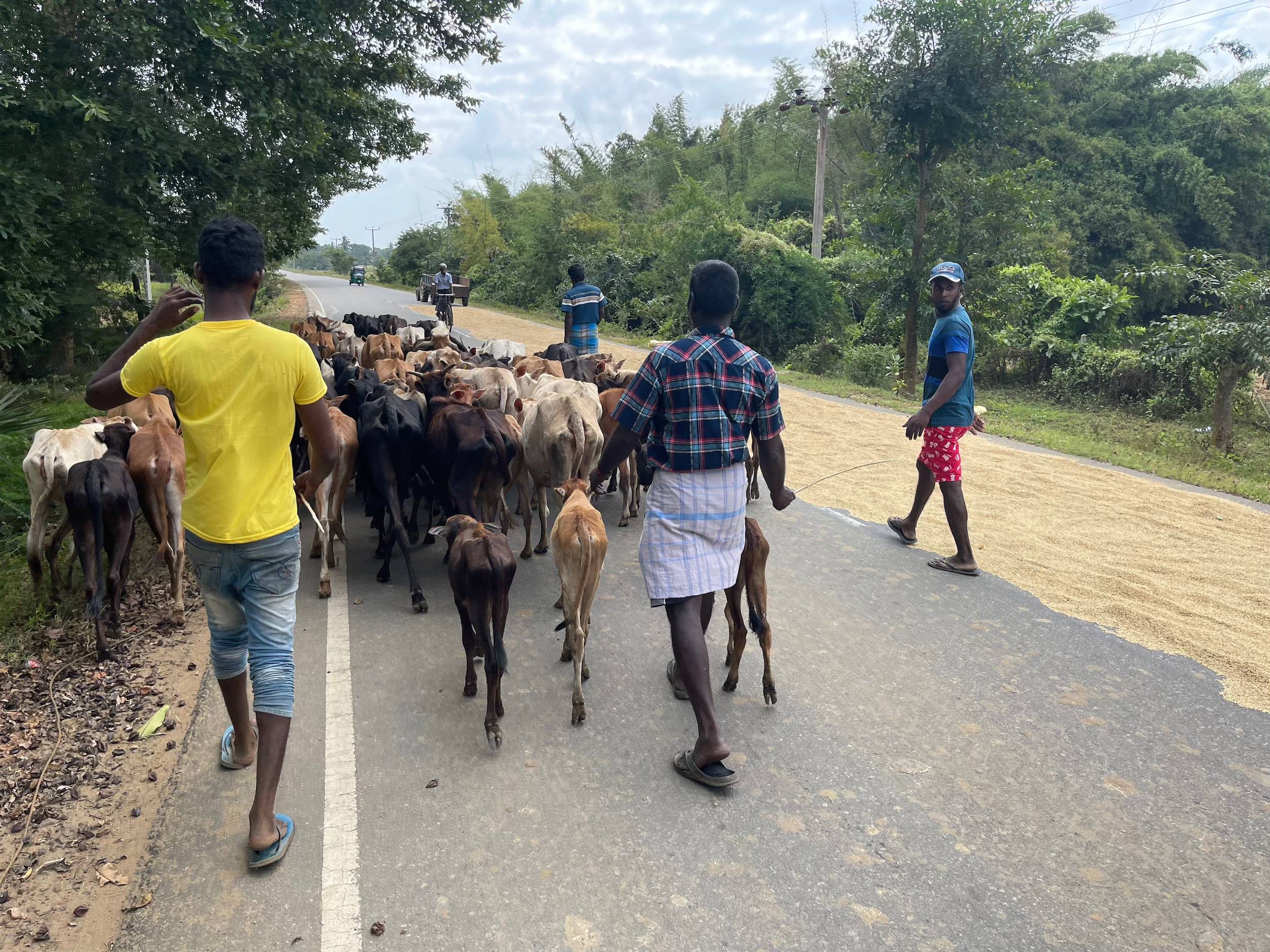 After the junction, the road gradually became quieter, and I found “my” cows, goats, buffaloes, and the rice fields again. It is harvest time, and farmers are busy gathering rice everywhere. There must be at least two harvests per year.