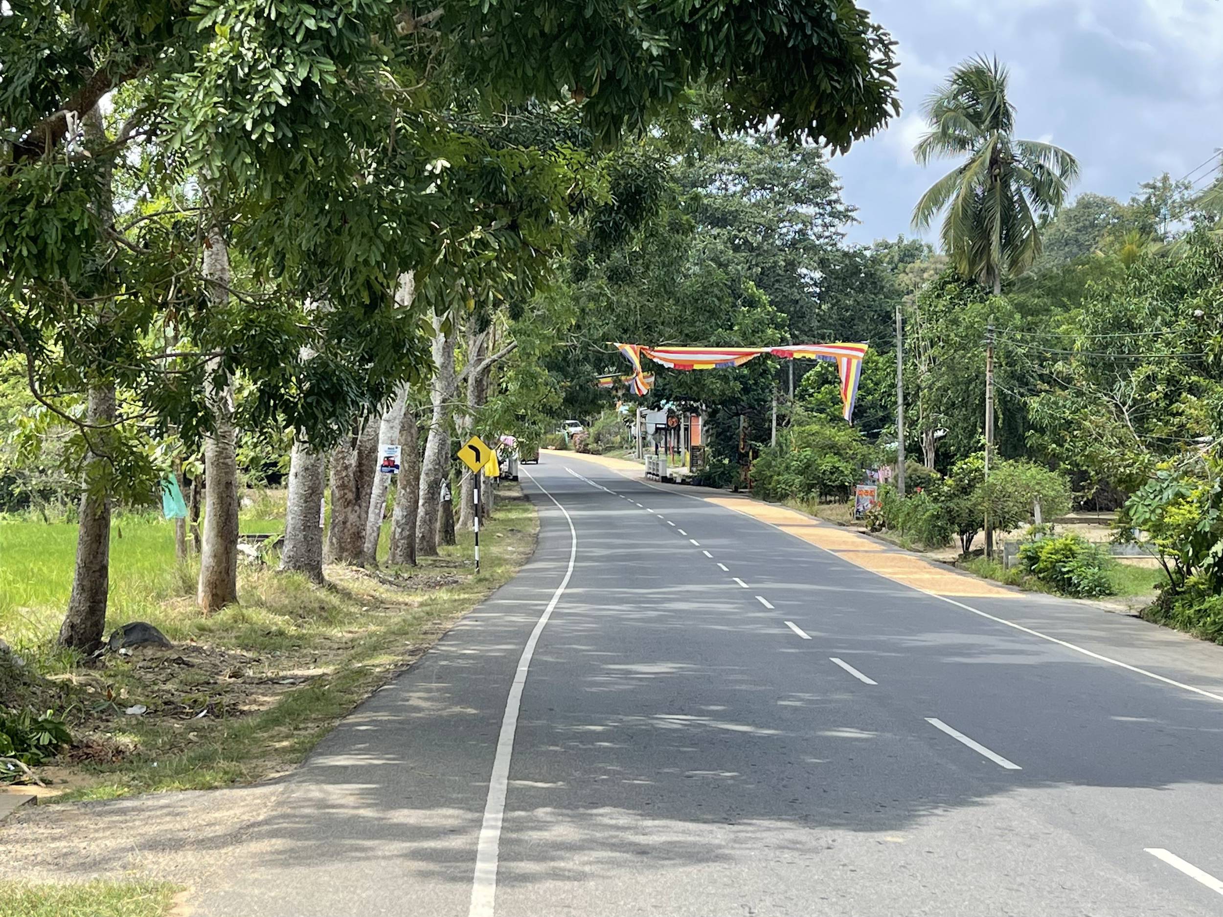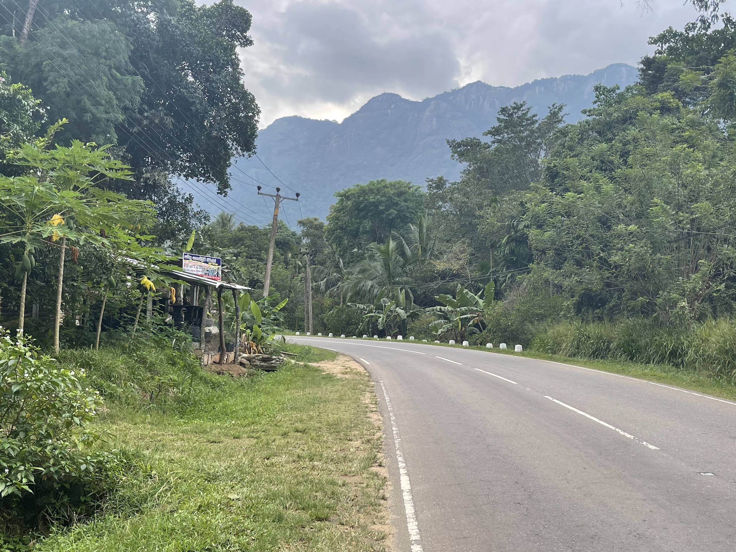 I resumed my ride toward Moneragala. Hilly, the road alternates long climbs and thrilling descents. Twenty kilometres from the destination, I couldn’t resist stopping to photograph a banana wholesaler, with trucks overflowing with massive bunches. The sturdy, friendly workers even offered me one.