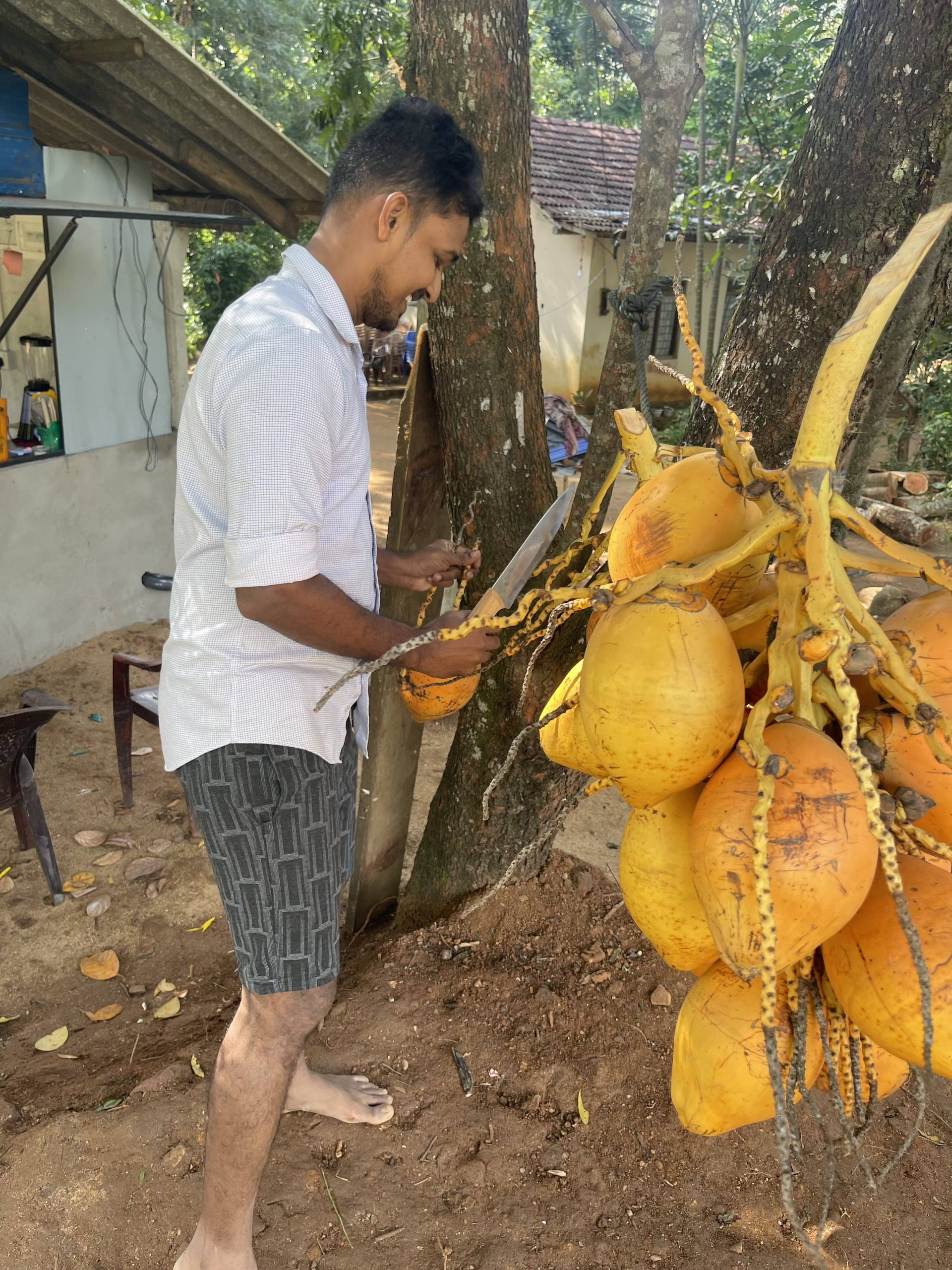 Quelques centaines de mètres plus loin, des noix de coco attirent mon regard. Un homme souriant s’approche. Après des heures de montées-descentes, la soif me tenaille. Récemment marié, il s’est installé chez son épouse et vient d’ouvrir son échoppe. Son anglais est passable ; on papote sans trop de peine. Il irradie la gentillesse. Sans que je demande rien, il me tend des tranches de pastèque juteuse et une banane. Les bananes ont la cote ici.