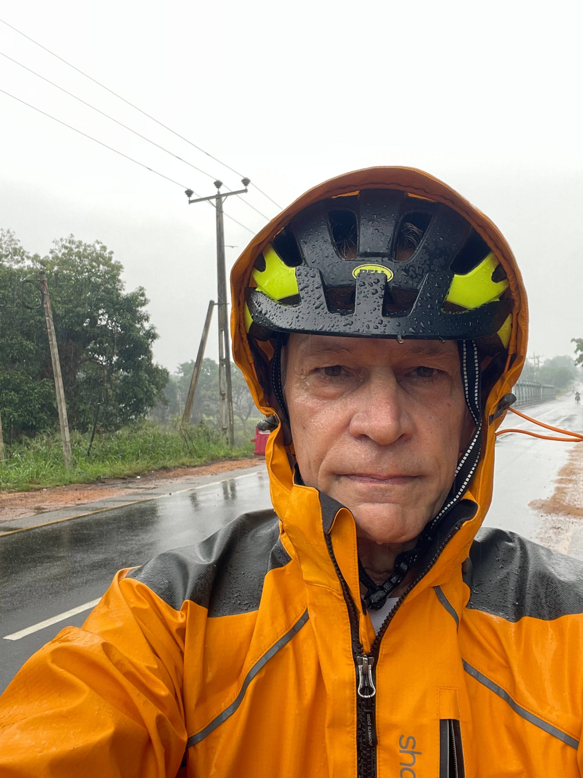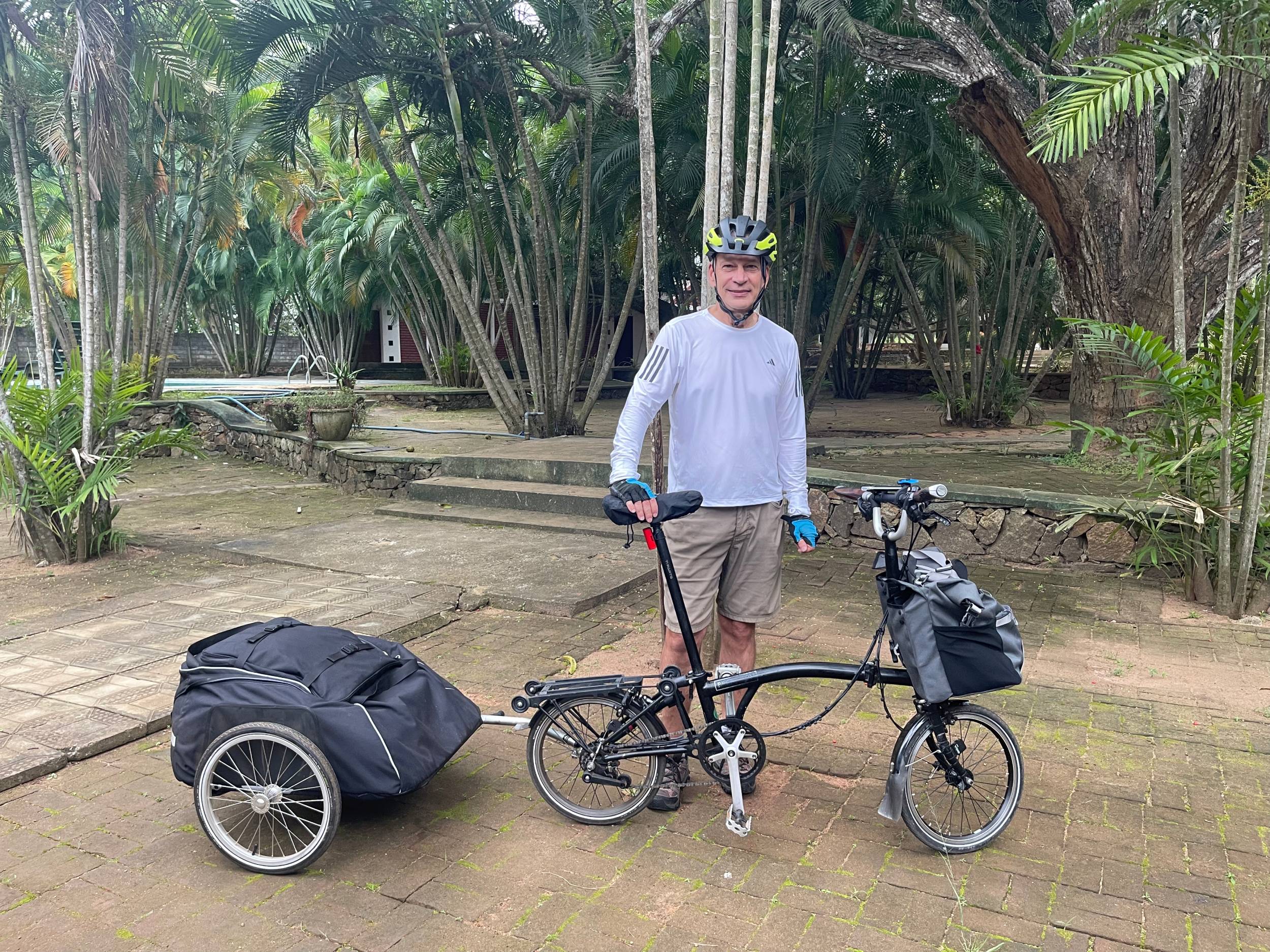 La circulation était faible et la route légèrement vallonnée, ce qui rendait le trajet très agréable. Vers la moitié du parcours, une fine pluie a commencé à tomber, avant de devenir plus soutenue. Je me suis arrêté pour couvrir la remorque, protéger le sac avant, enfiler mon imperméable et troquer mes chaussures contre des sandales. La pluie était chaude et douce sur mon visage. Une sensation qui n’était pas désagréable. Néanmoins, je suis arrivé à l’hôtel trempé et la remorque toute sale. Hormis la housse protégeant la remorque, tout mon équipement est réparti dans plusieurs sacs étanches, ce qui le protège efficacement de la pluie.
