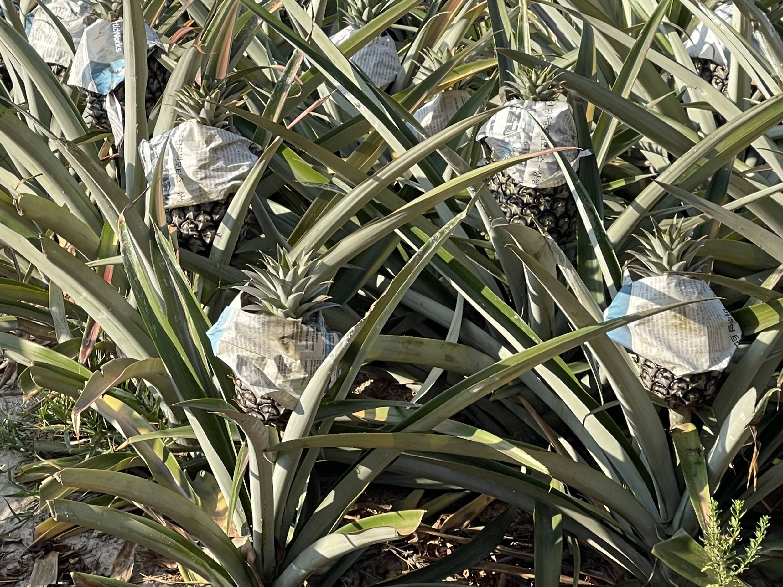 - Dans certains champs, ils enrobent l'ananas avec du papier journal et dans d'autres, ce sont des branches d'arbustes, je crois